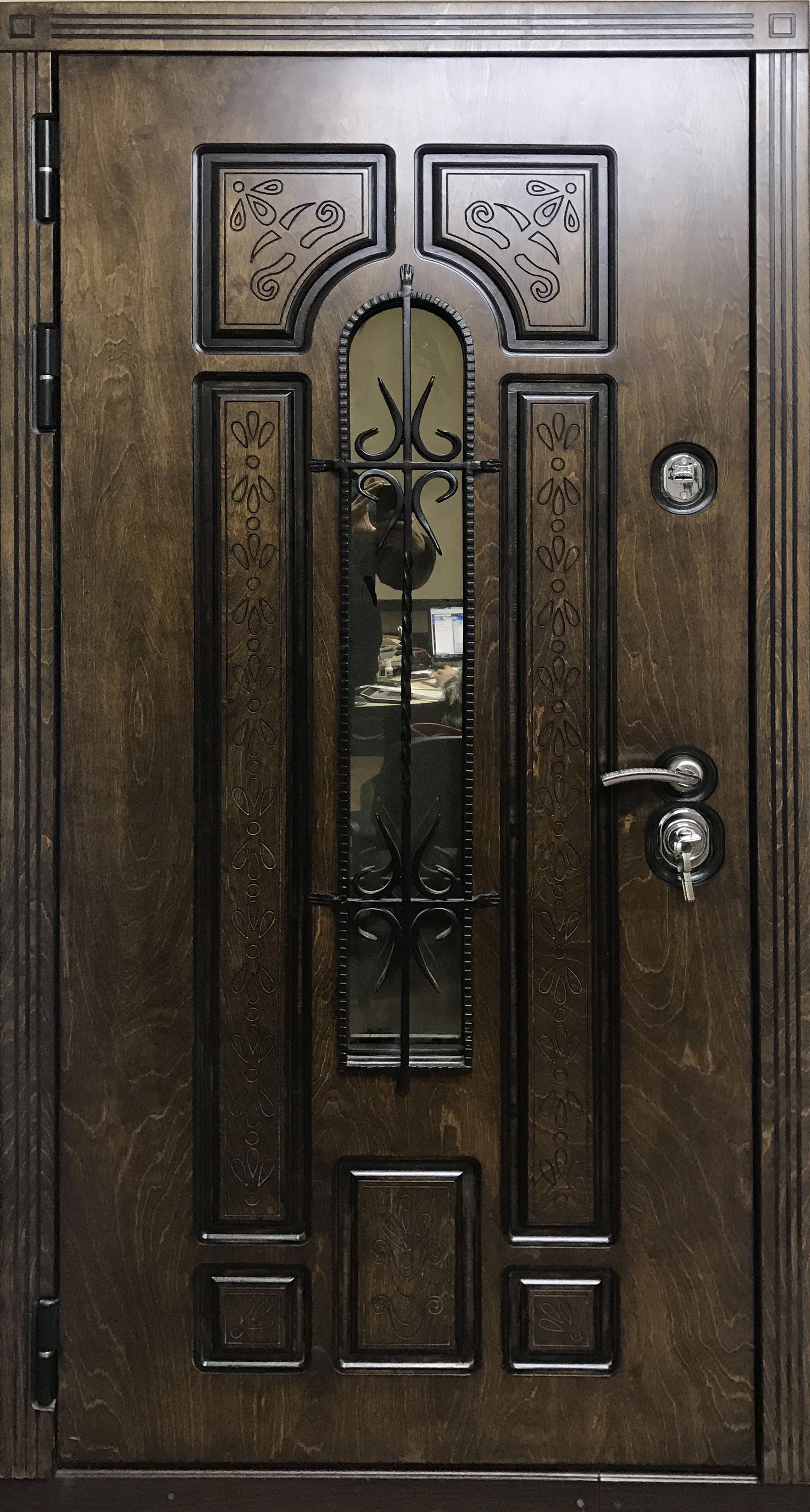 Металлическую дверь из корабельной фанеры можно декорировать ковкой и стеклом, витражом, зеркальными вставками. При установки такой двери в коттедж, стоит рассмотреть вариант изготовления двери с терморазрывом. Это позволит не делать в доме холодный тамбур, но при этом сохранить в доме тепло.
