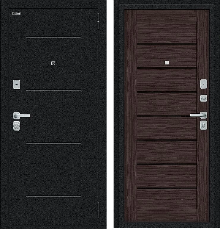 Надежная входная Дверь Браво Техно/BChrome Букле черное/Wenge Melinga премиум класса по цене 34 579 руб. Большая толщина стали защитит от проникновения в ваш дом, квартиру или коттедж. Используется очень качественная фурнитура: замки, цилиндры, ручки, защелки. Покрытие и отделка двери изготовлено под внимательным контролем производителя. Дверь имеет долгий срок службы и гарантию.